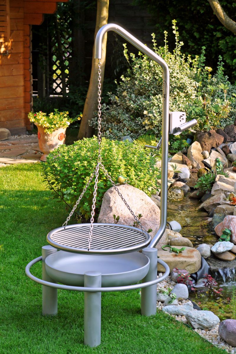 Der Grillgalgen ist leicht nach oben, aus seiner, am Standfuß der Feuerschale angeschweißten Steckverbindung, herausnehmbar. Dadurch ergibt sich auch die Möglichkeit nach dem Grillen die Feuerschale als solche weiter zu benutzen. Der Grillgalgen läßt sich zur Seite schwenken und durch eine montierte Seilwinde aus Edelstahl verstellt man mühelos und sicher in der Anwendung, den Grillrost zum Feuer.