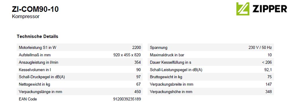 Der ZIPPER ZI-COM90-10 Kompressor ist riemenbetrieben und eignet sich zum Betreiben verschiedenster pneumatischer Werkzeuge mit bereits hohem Luftbedarf. Mit dem großen Kesselvolumen von 90 Litern ist er bestens für die meisten Einsatzzwecke geeignet. Der ZI-COM90-10 läuft einphasig mit 230 V und passt somit nahezu in jede Werkstatt.