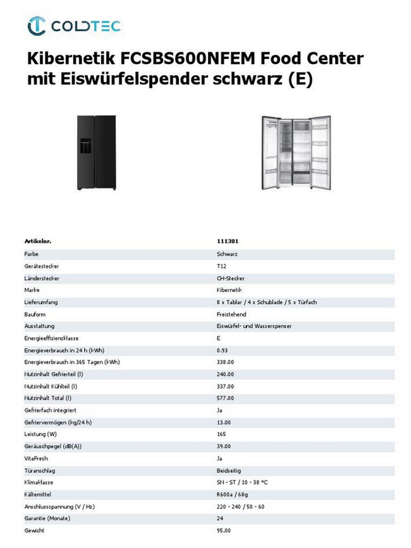 Der Kibernetik FCSBS600NFEM Food Center überzeugt durch grosszügiges Fassungsvermögen und moderne Kühltechnologie. Mit einem Gesamtnutzinhalt von 577 Litern, bestehend aus 337 Litern Kühlraum und 240 Litern Gefrierteil, bietet er reichlich Platz für eine strukturierte Vorratshaltung. Acht Tablare, vier Schubladen und fünf Türfächer ermöglichen eine flexible Organisation. Der integrierte Eiswürfel- und Wasserspender sorgt für zusätzlichen Komfort im Alltag. Dank No-Frost-Technologie entfällt das manuelle Abtauen, während VitaFresh-Schubladen für ideale Lagerbedingungen und längere Frische bei Lebensmitteln sorgen. Mit einem Gefriervermögen von 13 kg in 24 Stunden und einem leisen Betrieb von nur 39 dB(A) erfüllt das Gerät hohe Ansprüche an Leistung und Komfort. Der jährliche Energieverbrauch beträgt 338 kWh. Im eleganten schwarzen Design fügt sich das freistehende Modell stilvoll in jede moderne Küche ein.