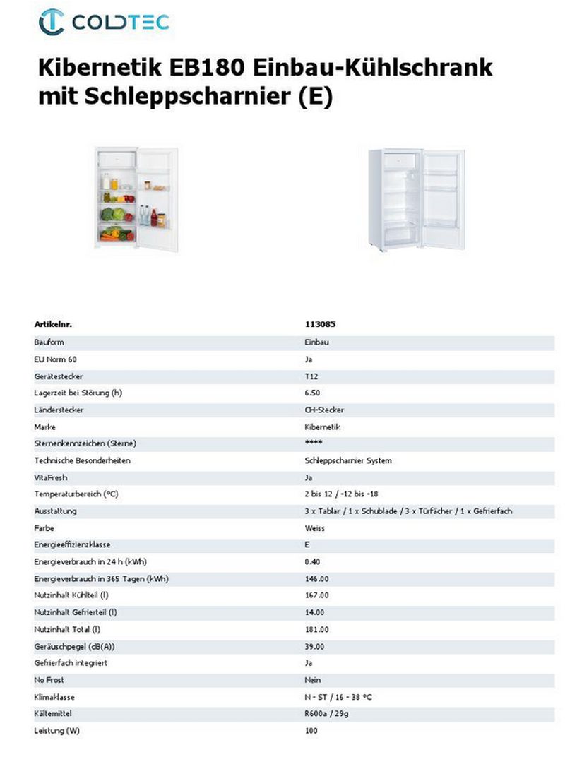 Der Kibernetik EB180 überzeugt als leistungsstarker und platzoptimierter Einbau-Kühlschrank für moderne Küchen. Mit einem Gesamtnutzinhalt von 181 Litern, davon 167 Liter im Kühlteil und 14 Liter im integrierten Gefrierfach, bietet er ausreichend Stauraum für frische Lebensmittel und Tiefkühlprodukte. Die durchdachte Innenaufteilung mit 3 Tablaren, 1 Gemüseschublade, 3 Türfächern und einer VitaFresh-Zone sorgt für optimale Übersicht und verlängerte Frische von Obst, Gemüse und Fleisch.Der Kühlschrank arbeitet effizient in der Energieeffizienzklasse E und verbraucht lediglich 0,4 kWh pro Tag. Mit einem leisen Geräuschpegel von 39 dB(A) bleibt er auch in offenen Wohnbereichen angenehm unauffällig. Das Schleppscharnier-System gewährleistet eine langlebige und stabile Verbindung zwischen Gerätetür und Möbelfront, während der wechselbare Türanschlag flexible Einbaumöglichkeiten bietet.
