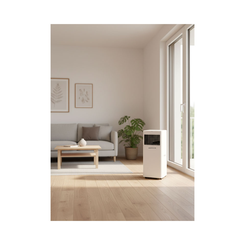 Das mobile 7000 BTU Klimagerät Light von Kibernetik bietet eine kompakte und effiziente Lösung zur Klimatisierung kleinerer Räume. Mit einer Kühlleistung von 2’000 W eignet sich das freistehende Gerät ideal für Raumgrössen bis 20 m² beziehungsweise 50 m³. Neben der Kühlfunktion stehen ein Entfeuchtungsmodus sowie eine Ventilatorfunktion zur Verfügung, wodurch ein angenehm ausgeglichenes Raumklima unterstützt wird. Zwei Ventilatorstufen, ein bis zu 24 Stunden einstellbarer Timer sowie ein übersichtliches Bedienfeld sorgen für flexible Einsatzmöglichkeiten. Die Steuerung erfolgt wahlweise direkt am Gerät oder komfortabel über die mitgelieferte Fernbedienung. Der im Lieferumfang enthaltene Abluftschlauch mit Fensteradapter ermöglicht eine unkomplizierte Installation.