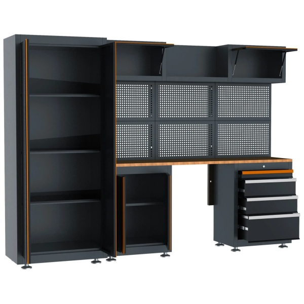 Das 13-teilige Cartech Schranksystem ist eine vielseitige Komplettlösung für die Organisation von Werkstatt oder Garage. Es besteht aus mehreren Schränken, Hängeschränken, Lochwänden und einer stabilen Arbeitsplatte. Die pulverbeschichteten Stahloberflächen sind besonders widerstandsfähig gegen Kratzer und Korrosion. Türen und Schubladen sind abschliessbar und bieten einen sicheren Stauraum für Werkzeuge und Zubehör. Die Lochwände ermöglichen eine flexible Anbringung von Werkzeughaltern und Haken. Die Schränke bieten viel Stauraum für Maschinen, Werkzeuge und Materialien. Die höhenverstellbaren Füsse sorgen für einen stabilen Stand auch auf unebenen Böden. Das moderne Design in Schwarz mit orangefarbenen Akzenten passt in jede Werkstattumgebung.